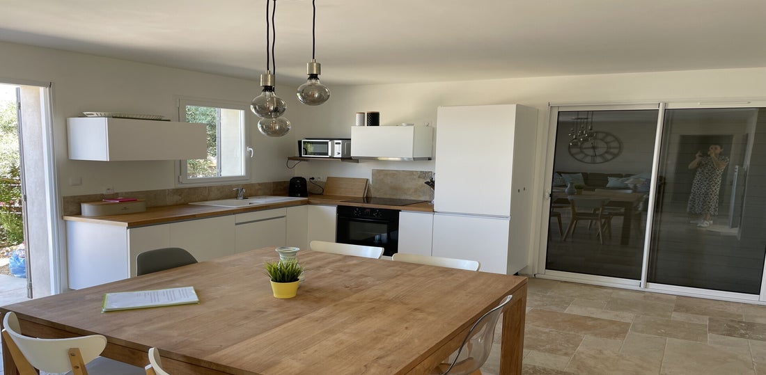 Grote living met veel licht en zicht op de prachtige Mont Ventoux met comfortable zetel, salontafel, TV met TV-kast en een eettafel.Volledig uitgeruste keuken met vaatwas, microgolf, oven, koelkast, diepvries en alle overige benodigdheden. Wasmachine en strijkijzer.